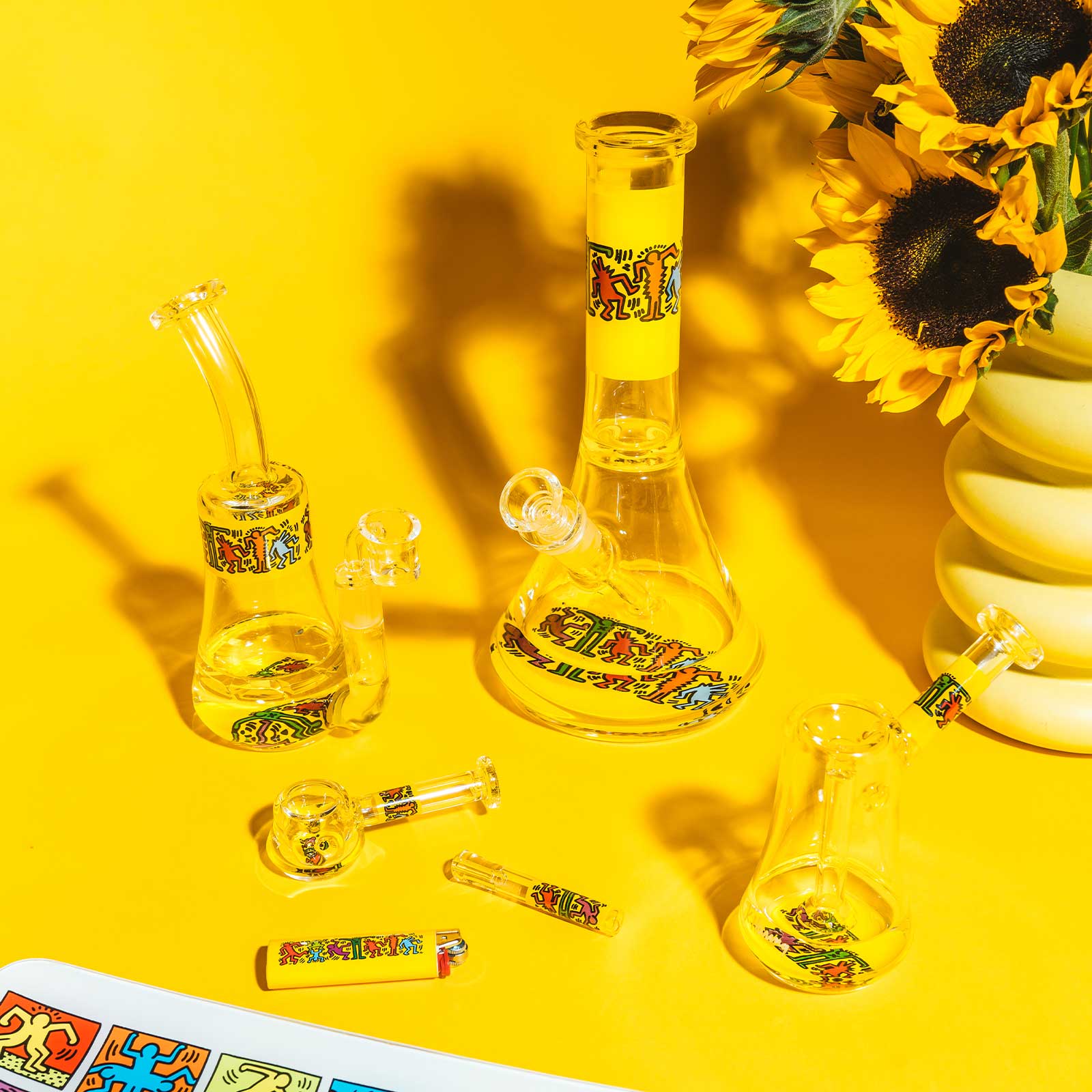 Ces pipes en verre colorées sont disponibles dans différentes variantes, comme Yellow et Multi-blue, qui mettent toutes en valeur différentes figures et dessins classiques de Keith Haring.